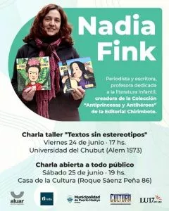 Puerto Madryn sigue recibiendo la visita de destacados autores. En esta oportunidad, la periodista y escritora, profesora dedicada a la literatura infantil y creadora de la colección “Antiprincesas” y “Antihéroes” de la Editorial Chirimbote, Nadia Fink, estará en la ciudad para hacer referencia a sus obras.