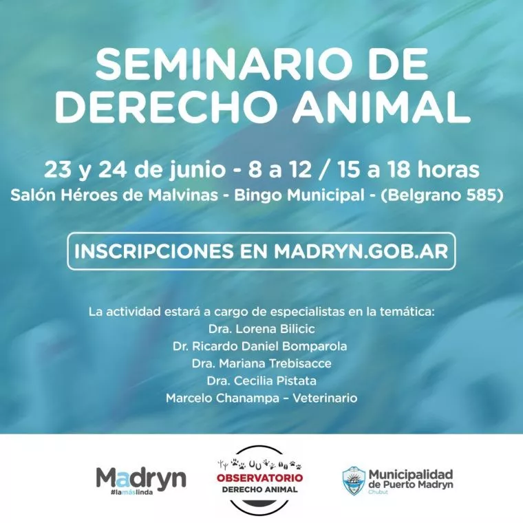 La Municipalidad de Puerto Madryn a través de la Dirección de Veterinaria y Zoonosis en conjunto con el Observatorio de Derecho Animal Argentina, invitan al Seminario de Derecho Animal. Esta actividad será gratuita y se llevará a cabo el 23 y 24 de junio de 8 a 12 y de 15 a 18 horas en el Salón Héroes de Malvinas del Bingo Municipal, ubicado en Belgrano 585. Las inscripciones se pueden realizar en madryn.gob.ar