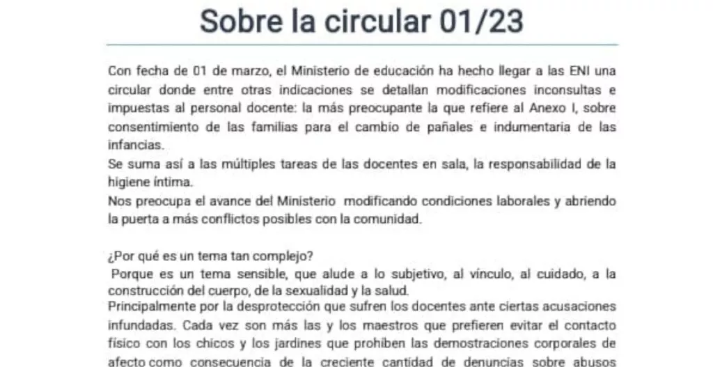 Cabe agregar que el Ministerio de Educación del Chubut envió una circular en el que sugieren a los docentes de nivel inicial, "pedir el consentimiento de las familias para el cambio de pañales e indumentaria de las infancias”.