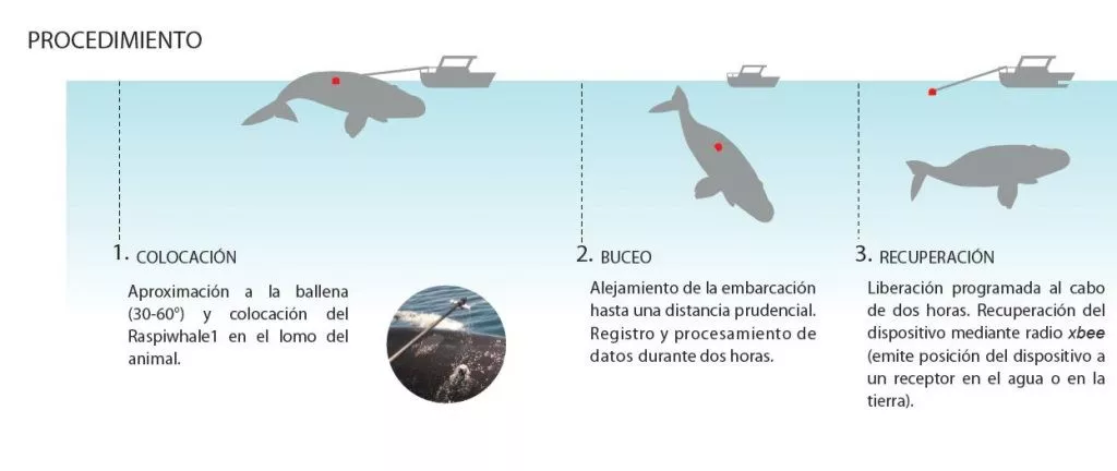 Para realizar este estudio, los investigadores recabaron información registrando, tanto la cantidad de embarcaciones como de ballenas, y realizaron una zonificación del área, generando un mapa virtual de las posibles interacciones entre ballenas y embarcaciones. Además para evaluar el movimiento y la conducta de los animales, desarrollaron el Raspiwhale, un dispositivo que cuenta con un microprocesador, que permite registrar diferentes variables y filmar a la ballena debajo del agua.