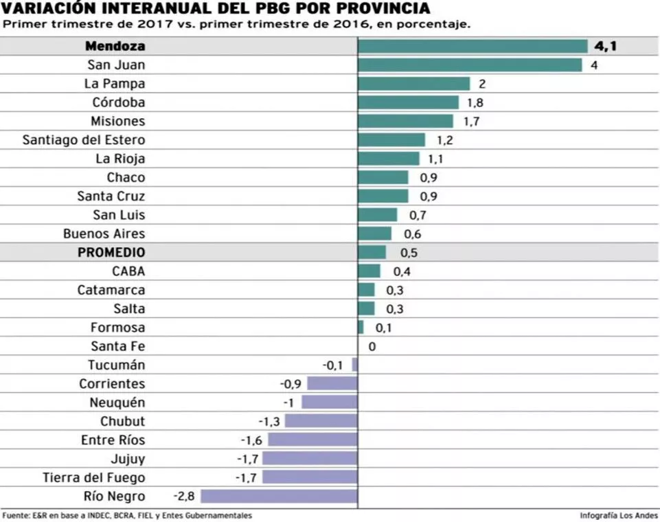 El informe publicado en el diario Los Andes de Mendoza, da cuenta además que el Producto Bruto Geográfico total del país marcó, en igual periodo, un crecimiento del 0,5%.