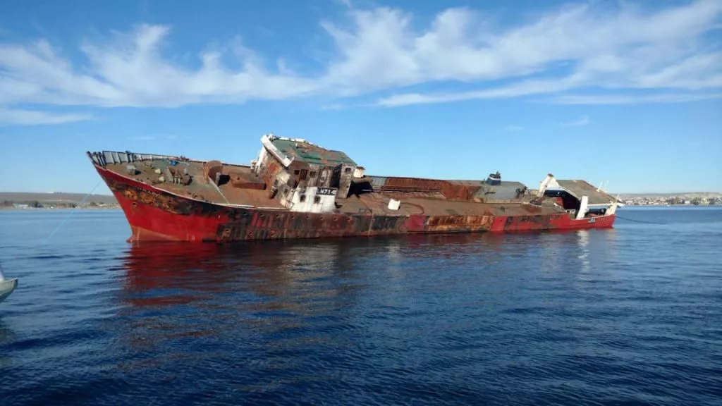 El buque incendiado en septiembre de 2017 quedó depositado en el fondo del golfo, a metros del potero chino hundido en enero, ambos cerca del Monumento al Tehuelche.