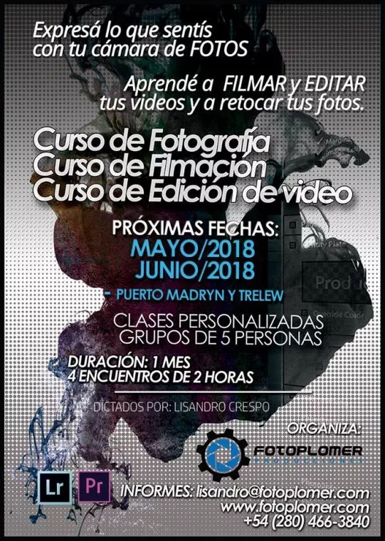 Lisandro Crespo de la productora audiovisual Fotoplomer dictará cursos multimedia durante el mes de mayo. En esta oportunidad y como novedad, se implementará un curso de filmación de video y uno de edición de video, sumándose a los clásicos cursos de fotografía básica que se han realizado con éxito en Trelew y Playa Unión desde 2015 hasta la fecha.
