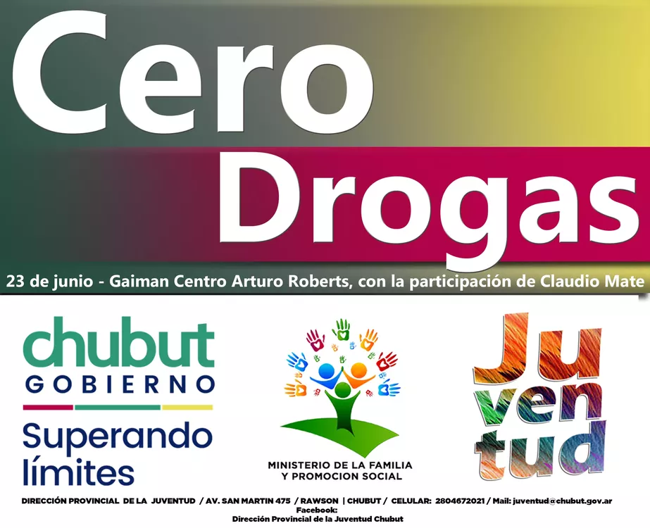 Este jueves desde las 9 horas, el Ministerio de la Familia y Promoción Social, que conduce Leticia Huichaqueo, a través de la Dirección de Juventud, llevará a cabo en la localidad de Gaiman el "I Encuentro Cero Drogas". Durante la actividadl, el responsable de la Agencia Provincial para la Prevención de la Drogadependencia, Claudio Mate Rothgerber, ofrecerá una interesante exposición sobre las adicciones.