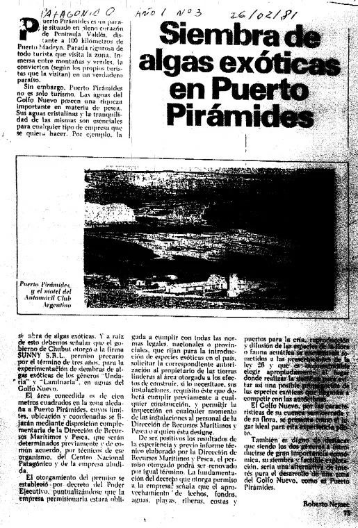 Prueba lo señalado, la publicación que compartimos en esta nota del Diario El Patagónico del día 26 de febrero del año 1981 y en la que se informa que el gobierno de Chubut otorgó por decreto del Poder Ejecutivo, a la firma SUNNY S.R.L, permiso precario por el término de tres años, para la experimentación de siembras de algas exóticas de los géneros “Undaria” y “Laminaria”, en aguas del Golfo Nuevo.