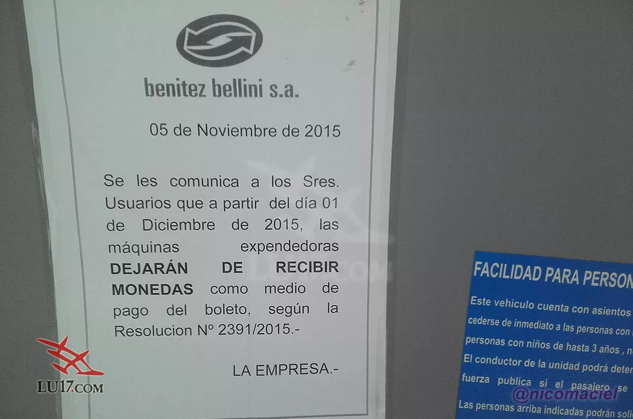 DESDE DICIEMBRE SE TERMINA EL PAGO CON MONEDAS EN LOS COLECTIVOSNicolás MacielActualidad18/11/2015 Benitez Bellini publicó en algunas de las unidades, que a partir del 1 de diciembre se dejará de ...